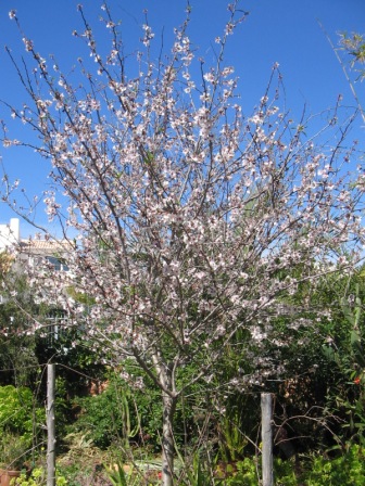 Die Mandelblühtezeit ist im Februar, außer meinem, der scheint der einzige zu sein, der dann blüht wenn die Anderen verblüht sind. Ich schätze das liegt an der nähe des Meeres.